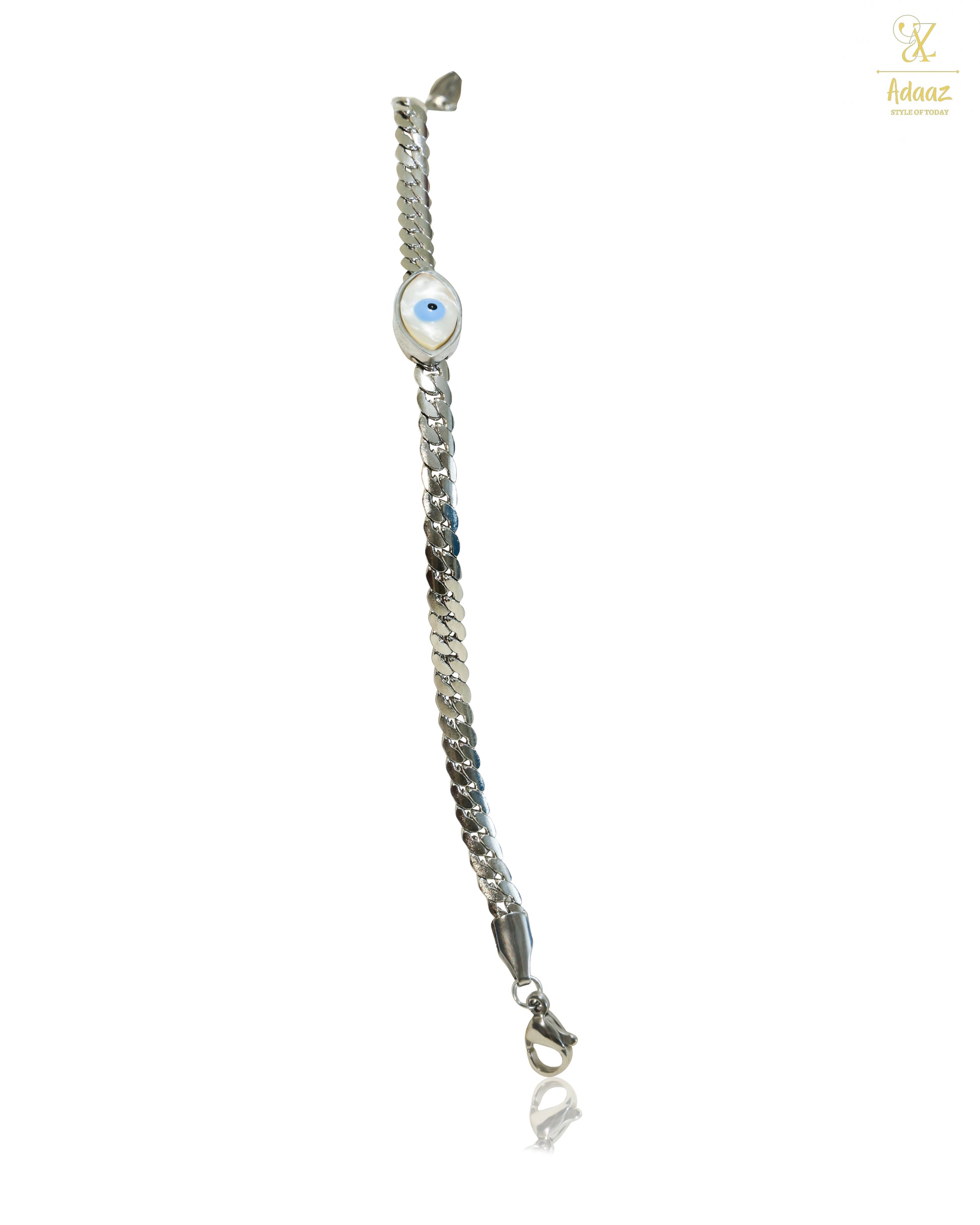 - This chain bracelet features a sophisticated design with a delicate gold chain and a central Evil Eye charm made from Mother of Pearl (MOP).